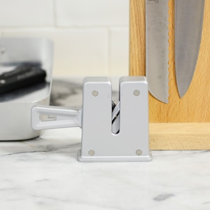 本体はABS樹脂で軽量、ハンドル部分はフック掛けもでき、場所を取らないコンパクトサイズで、引き出し収納も可能です。バターナイフやペティナイフなどの小型ナイフも、手軽に研ぎやすく便利。 テイラーズ・アイ・ウイットネスのロングセラーシャープナーです。