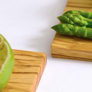自然なオリーブの木目を生かしつつ、モダンでシャープな形に仕上げました。軽量で持ち運びしやすく、普段使いのプレートとして前菜やパンなどがコンパクトに盛り付けられます。