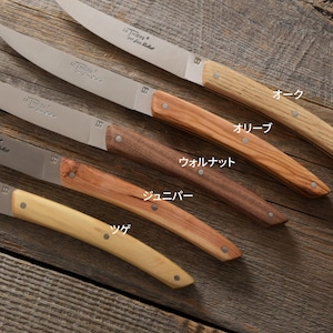 フランス中央部、オーベルニュ地方に位置する刃物産業で名高い町、ティエール。その地の代名詞となっているナイフ、ル・ティエール〈LeThiers〉はティエール刃物産業協会より確立され、一定の基準をクリアした工場のみ生産が許されています。ジャン・デュボ社で作られるル・ティエールの中でもハンドル部分に個性的な木材が使用されているステーキナイフをセレクトしました。