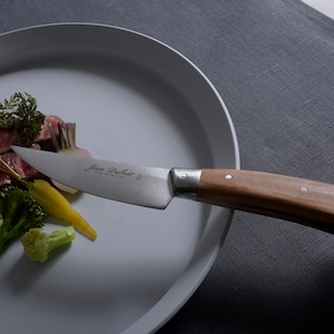 フランスで人気のシェフ、クリスチャン・エッシュベストのリクエストにより考案されたユニークなデザインのステーキナイフ。頑強なブレード(刃)に加え安定感のある大きめのグリップが食卓にインパクトを与えます。ハンドルはナチュラルなオリーブウッドとつややかで華やかなアクリルからお選びいただきます。